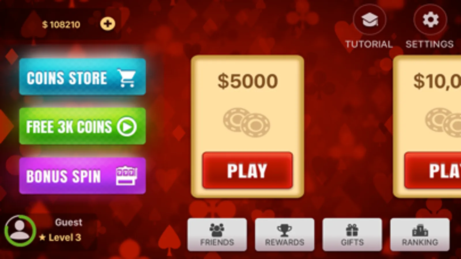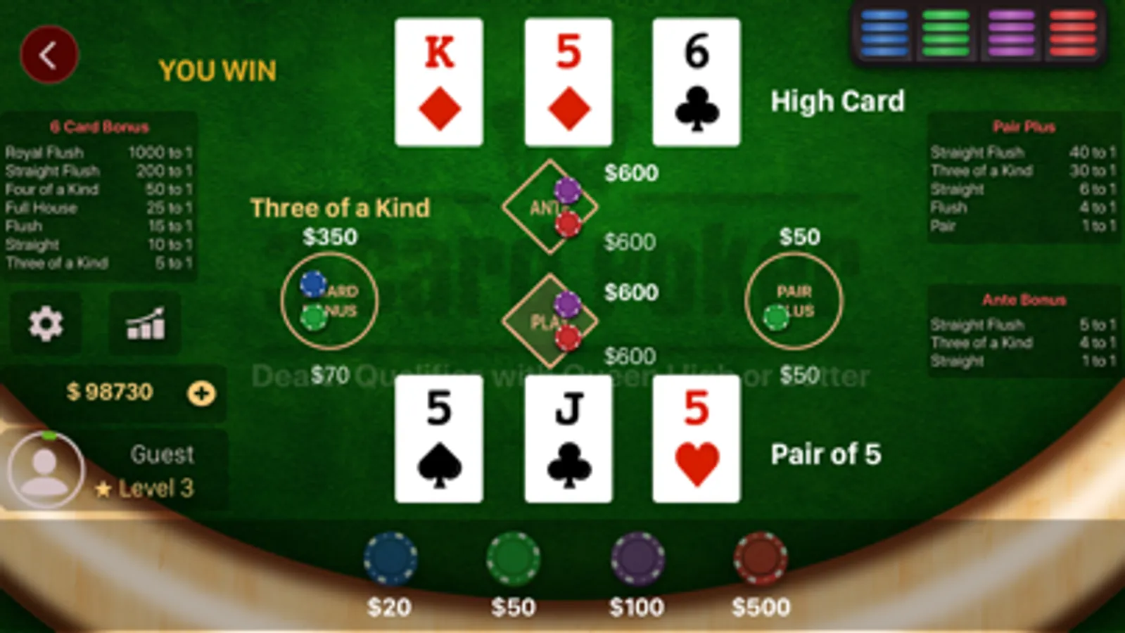 You can start playing the 3 Card Poker as soon as you open our game with 100,000 Bonus chips.