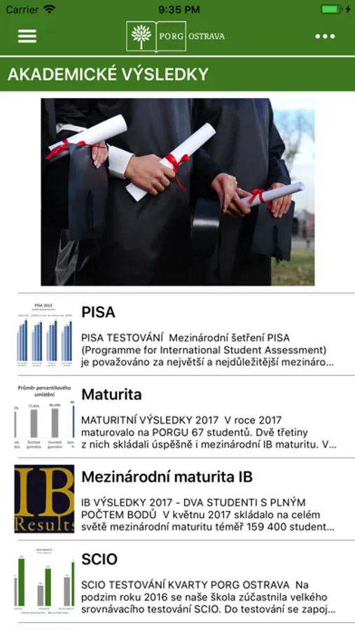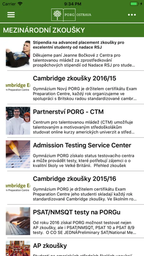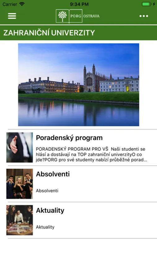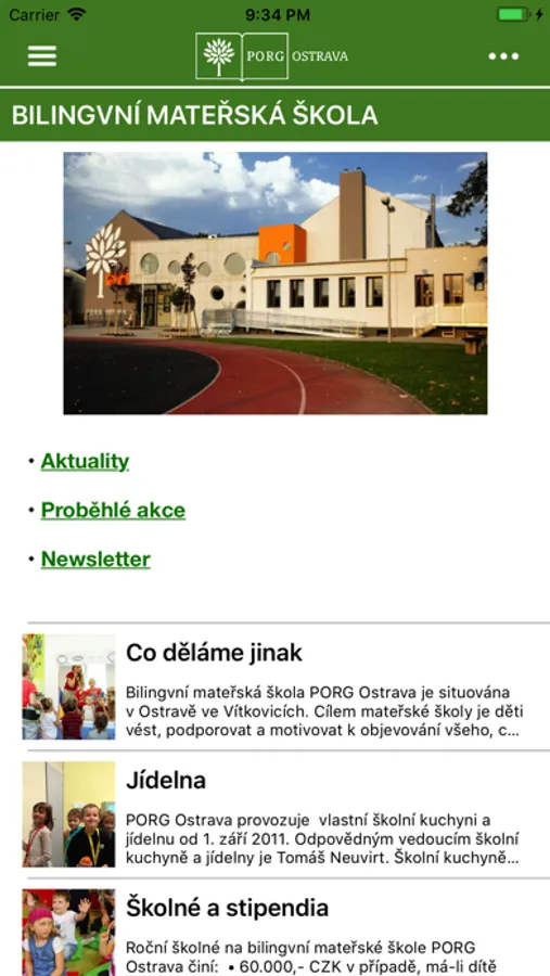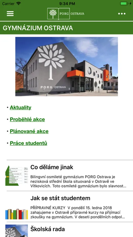 Mobilní aplikace PORG Ostrava přináší jednotlivé informace o možnostech studia na PORG Ostrava - gymnázium, ZŠ, MŠ. Přináší informace o škole a jak fungují, o zaměstnancích, školném, přijímacím řízení, průběhu školního roku, možnostech zakončení studia a další. V aplikaci také naleznete důležité kontakty a informace o zahraničním studiu.