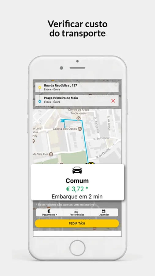 Está pronto para chamar ou agendar um táxi podendo desde logo, selecionar o meio de pagamento, escolher o tipo de viatura e colocar a morada de destino para obter uma estimativa.
