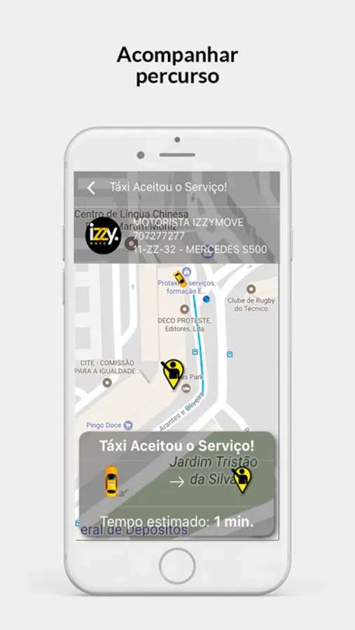 A partir do momento em que o motorista aceita o serviço, passa a acompanhar tudo em tempo real, tendo acesso imediato à informação sobre o motorista, veículo, trajeto e tempo estimado de chegada do táxi.