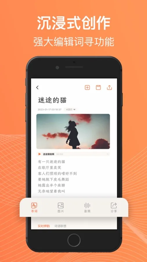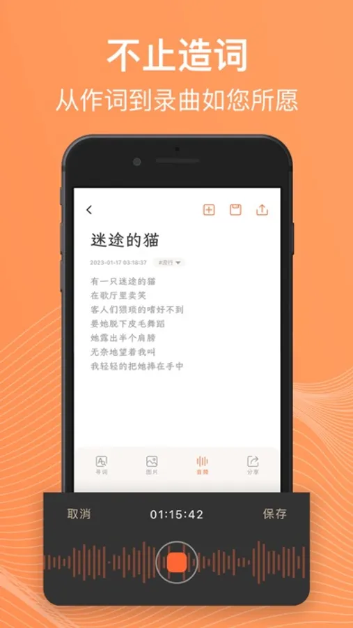 * 高效干净的歌词编辑器 不仅可以写词 还能录制音频, 不论何种灵感, 永不落下