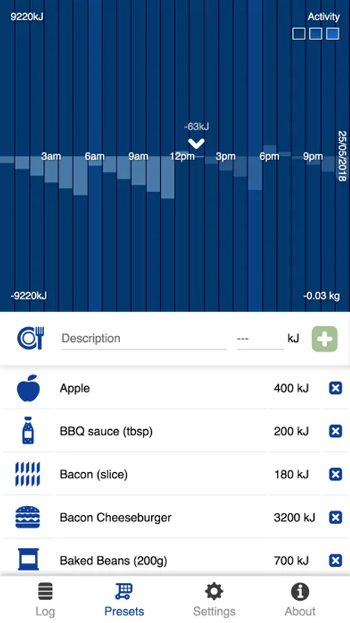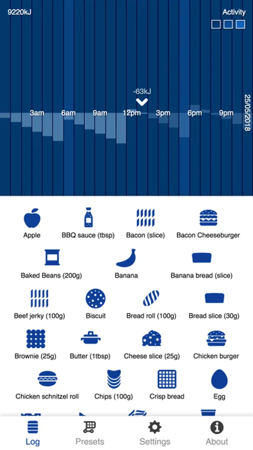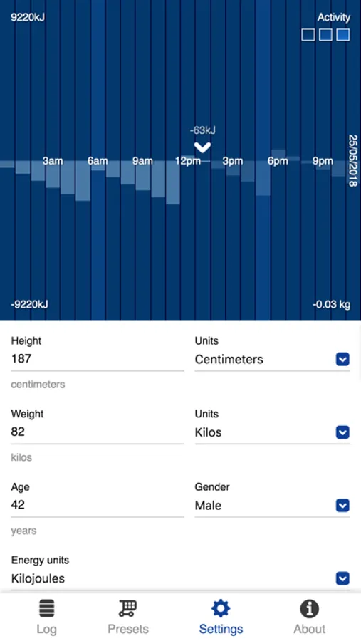 This app was made to visualise rough estimates of energy intake and expenditure throughout the day. Add presets for your own eating habits and keep track of your daily calorie limit in a graph.