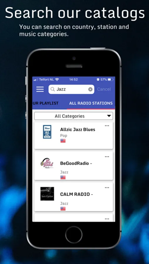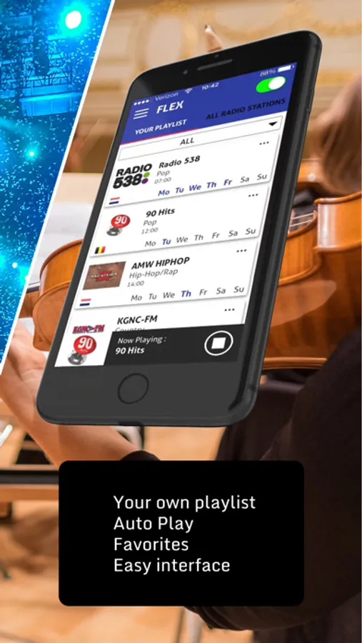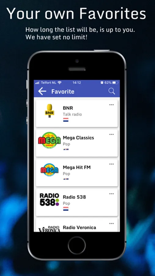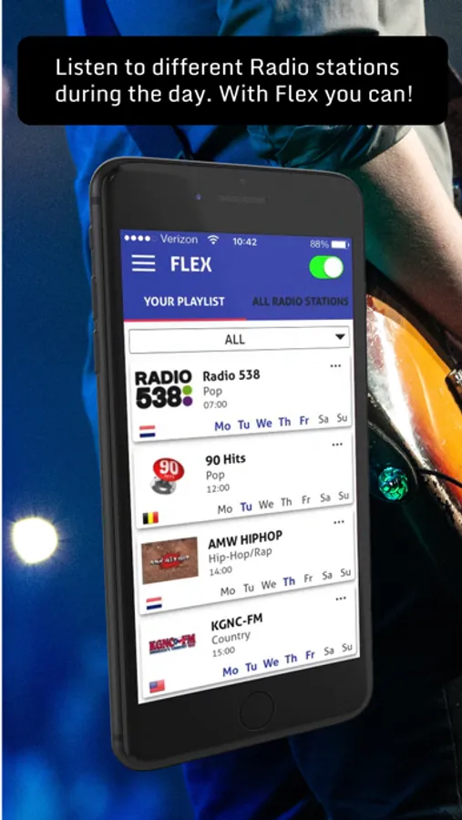 With the Flex Dynamic Radio App you can create your own playlist and switch per hour to another station of your choice. You can also use it to manually listen and collect your favorite radio stations worldwide.