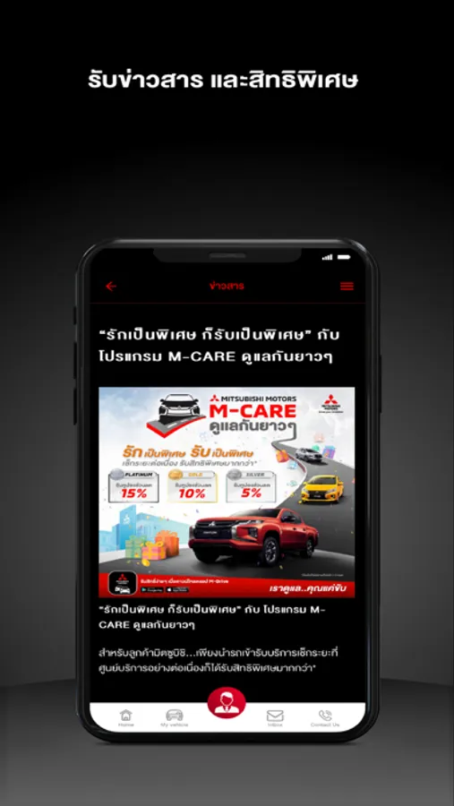 แอพลิเคชั่นที่พัฒนาขึ้นเพื่อเป็นตัวช่วยในการดูแลรถของคุณ ผ่านช่องทางที่รวดเร็วในการค้นหาผู้จำหน่าย หรือตรวจสอบสถานะในการเข้าบริการ รวมถึงการอัพเดทข้อมูลข่าวสารต่างๆ จาก มิตซูบิชิ มอเตอร์ส (ประเทศไทย) จำกัด ถึงลูกค้าทุกท่าน