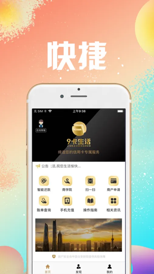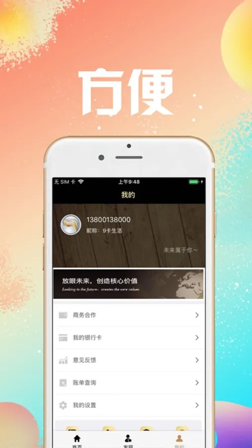 9卡生活是一款分享经济模式下的移动互联网支付+线下门店02O的创新产品,实现小微商家O2O面对面支付和线下门店收款,通过线上门店模式结合门店二维码收款,通过支付作为连接点衔接更多的线下商家,打造全新的营销体系和支付场景,改变我们的传统未来方向,创造无限的可能性,创新裂变的营销模式实现全民创业,万众创新的新格局。