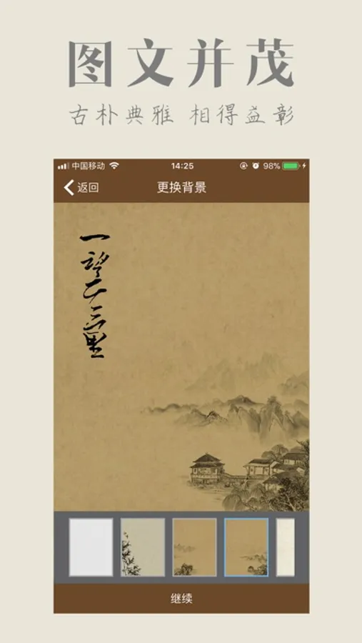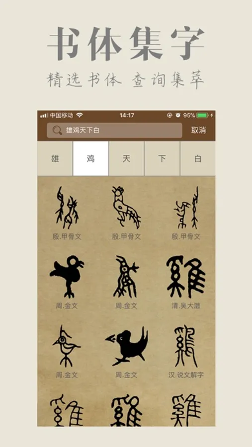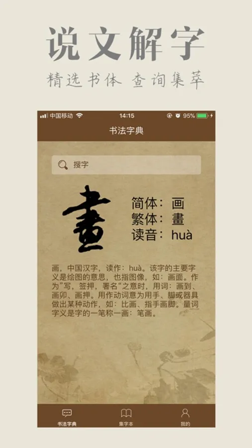 “画时书典”精心收集中国历代经典书法字体,整理成一套简单易用的“书法字典”,在提供“书体”查询、欣赏的同时还可以进行集字创作,多样模板灵活变换,呈现出古朴典雅的视觉效果,用书法弘扬传统文化,让经典焕发新生。