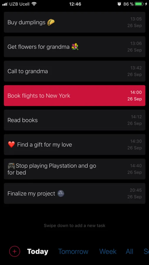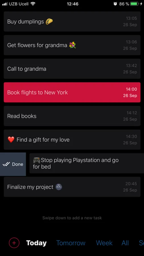 Swipe right to mark task as done, swipe left to postpone task and swipe down to add a new task. Adding a new task is always available by tapping on a plus button.