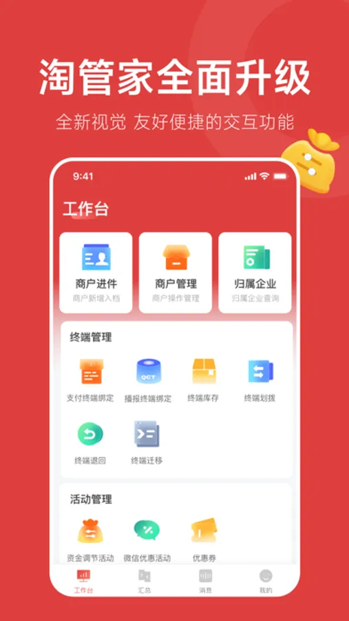 淘管家CRM为旗下全国服务商人员提供移动化业务协作平台,包括商户资料录入、进件申请、设备服务、售后等业务处理。