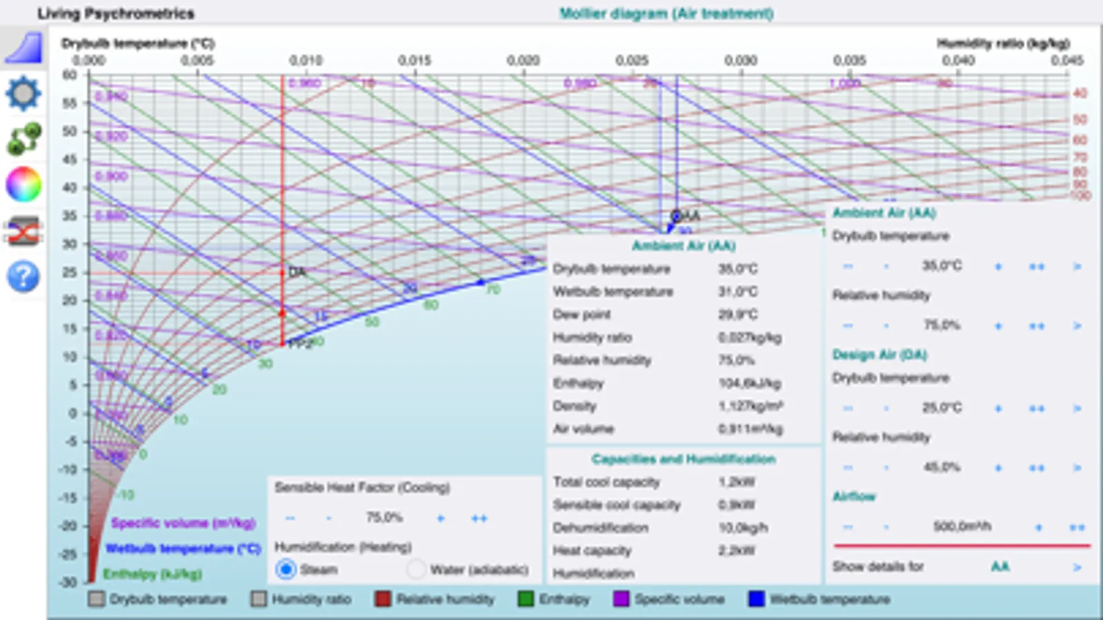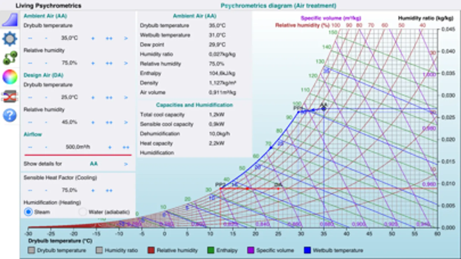 This app offers four different calculations and shows the results both in a pane and on a psychrometric diagram: