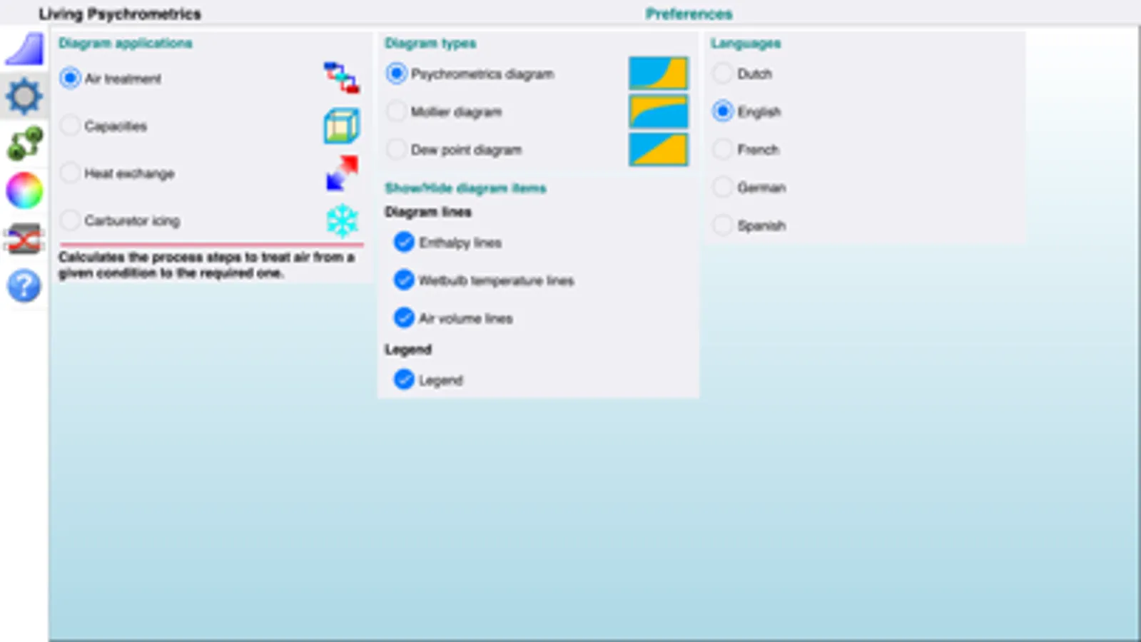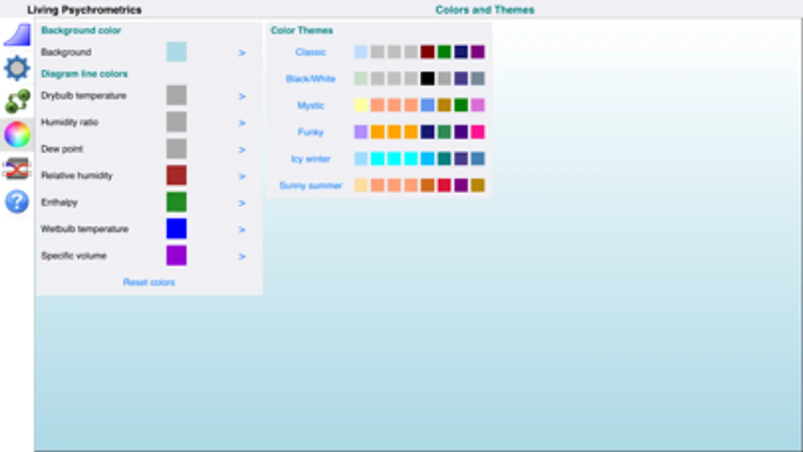 - Choose one of the diagram types (Psychrometrics, Mollier or Dewpoint) for the graphical results. Hide some constant lines on the selected diagram to simplify it. Define colors for the diagram lines and the background gradient.