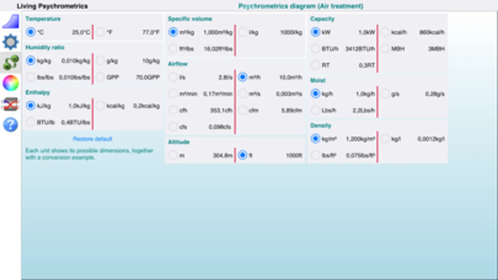 - Select two air properties to define a point: dry bulb temperature, wet bulb temperature, humidity ratio, relative humidity, enthalpy, specific volume and moist air density.