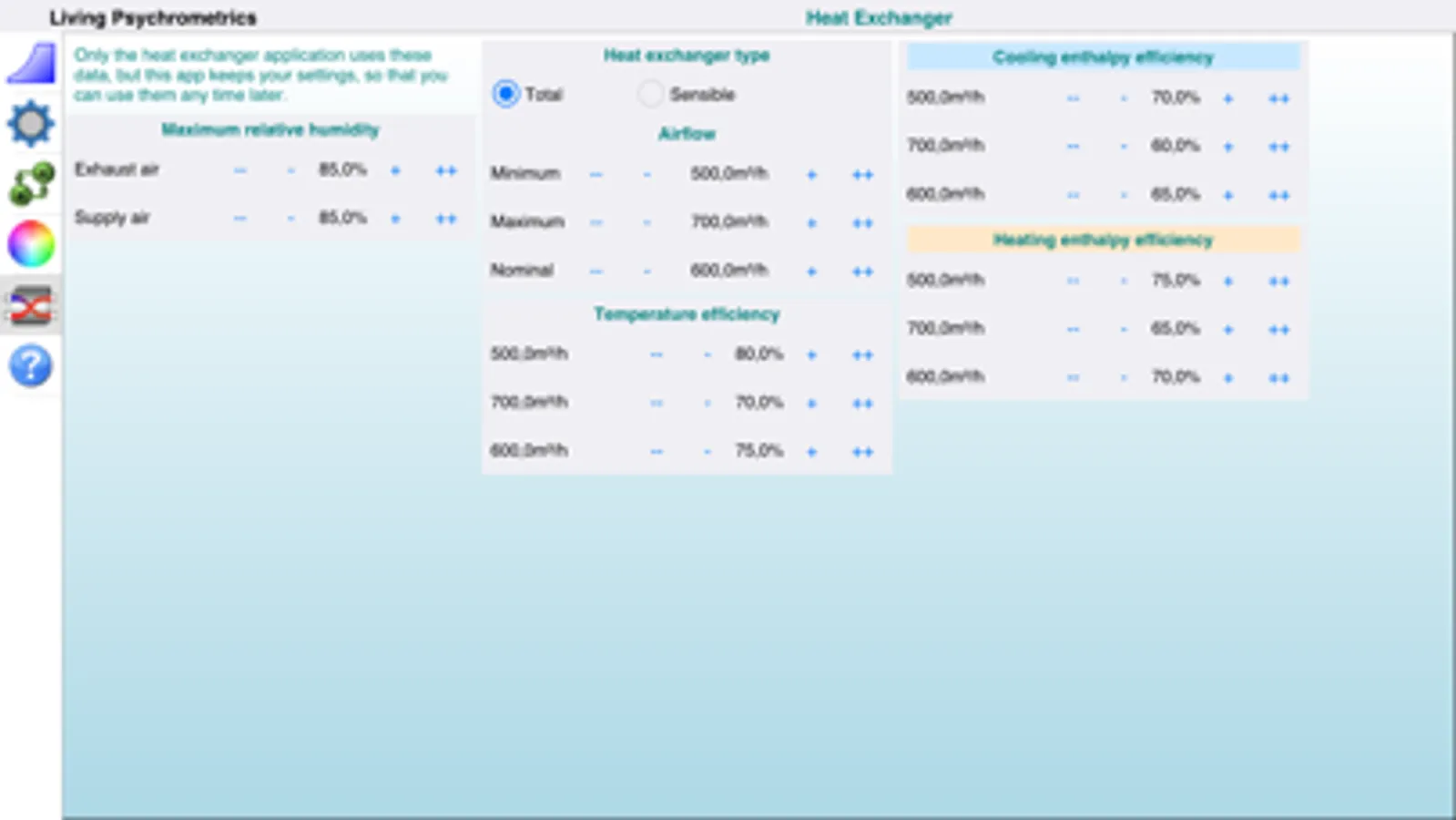 Calculates how warm room air heats up cool ambient air before supplying it as fresh air to the room. While heating up the ambient air, the heat exchanger cools down the room air, which may result in condensate. When the ambient air would be too cold, this calculation dimensions an electric heater to prevent condensate.