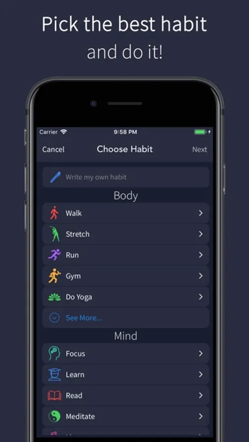 With the Habit Tracker app, you can select from any existing sample habits or create your own.