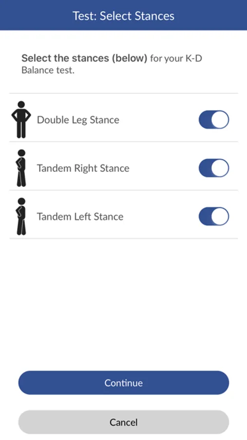 K-D Balance assesses three key balance stance metrics: double stance, right tandem stance and left tandem stance.