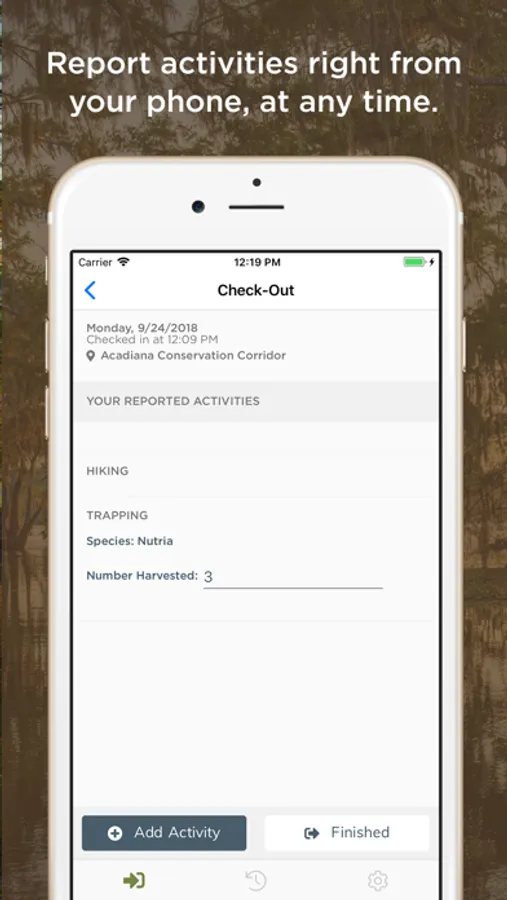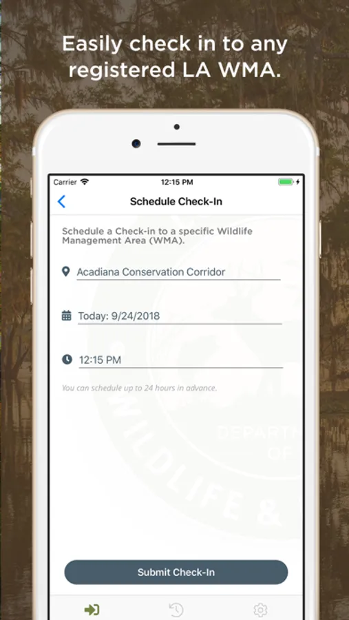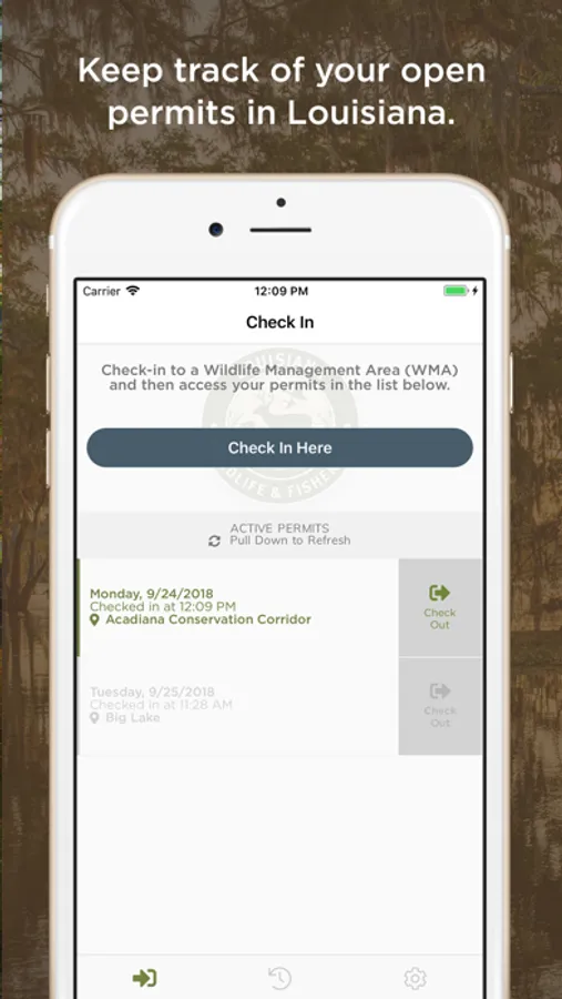 The Louisiana Department of Wildlife and Fisheries Wildlife Management Area System makes public lands available for recreation across the state. The WMA Self Clearing Permit App is a powerful tool for WMA users to complete the required self-clearing permit process from their mobile device. While physical self-clearing permit stations are available on our WMAs, LDWF offers this convenient mobile option to provide easy compliance with the self-clearing permit process. This application features a convenient, organized, drop down interface from which users may check in and out when they visit a WMA.