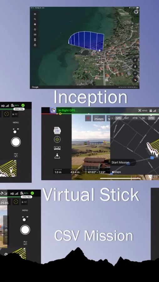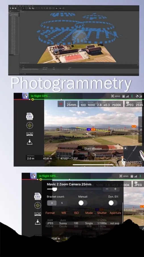 2D flat, vertical and 3D semi spherical photogrammetry missions. Virtual Stick and Mutable Mission support. The speed is automatized for JPG and RAW images. CSV mission import from the map-creator APP (iOS and Mac OS)