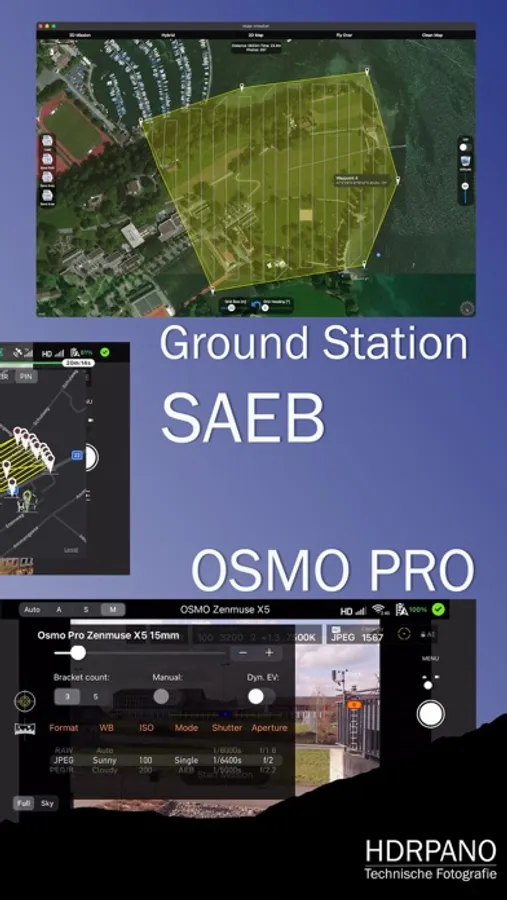Full spherical panoramas as waypoint mission and zenith assistant. The number of rows and columns is automatized for each focal length. Lens detection for Inspire and Matrice aircrafts. Gigapixel shootings with 2 batteries. Combine OSMO Pro X5 sky shootings for giga pixel panoramas.