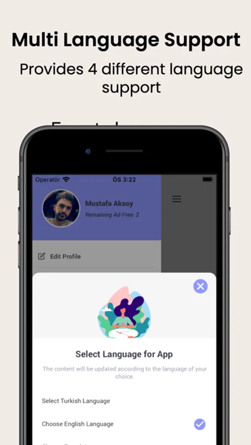 In our Meditation application, which has 4 different language options, you can access content in English, German, Turkish, and French.