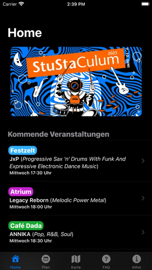 Gute Musik, anspruchsvolle Kleinkunst, sowie Sonne, Bier, Cocktails und gute Laune - das ist die "StuStaCulum"-Philosophie. Man darf auf ein anspruchsvolles Programm mit ca. 100 Auftritten unterschiedlichster Künstler gespannt sein!