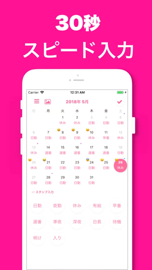 シフトをワンタップで入力でき、自動で次の日に移動するので、ポンポンと30秒間くらい入力することができます