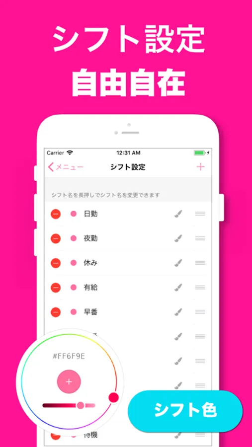 設定画面からシフトの名前、色、並び順をカスタマイズできます。自分好み、自分に合うように自由にカスタマイズしてください