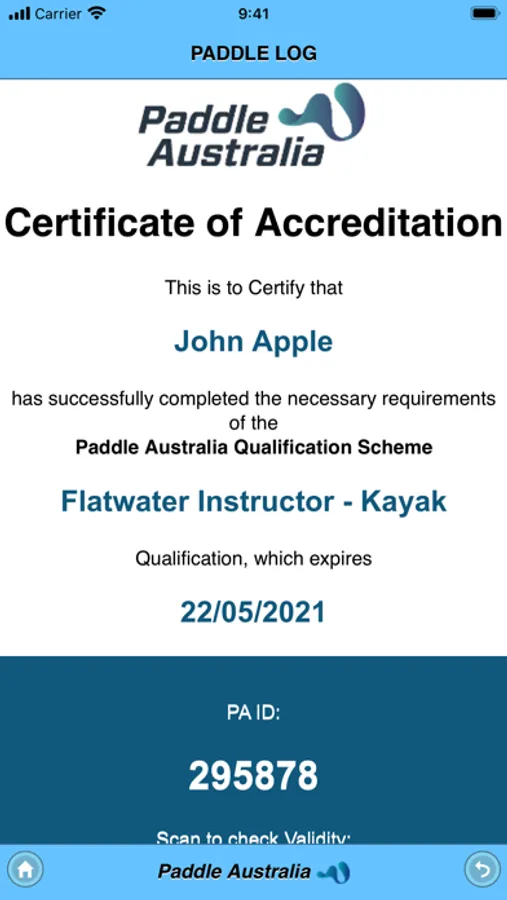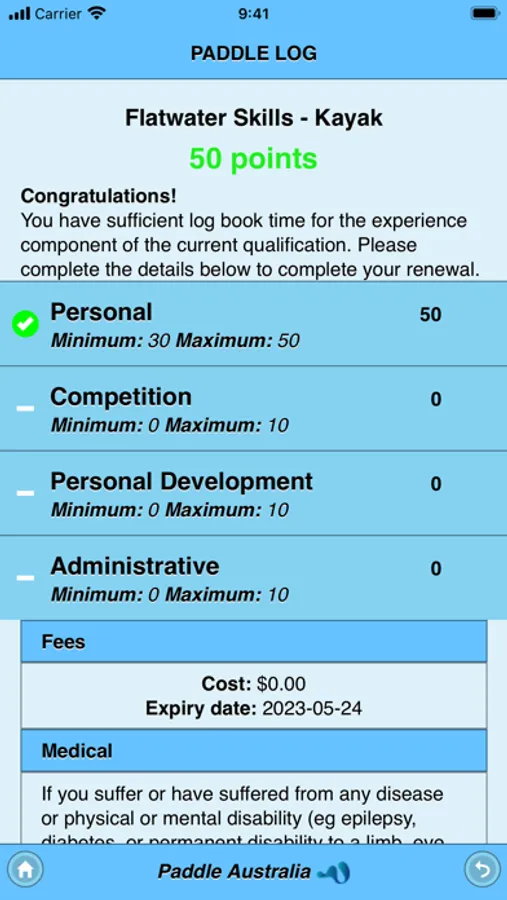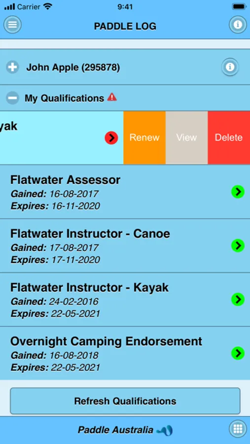Paddle Log also allows users to download details of their PAQS qualifications and be visually reminded of their expiry date. When an award is due for renewal, Paddle Log can renew the qualification directly from the app.