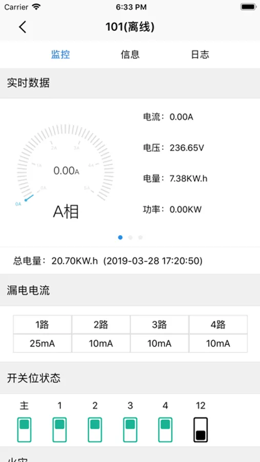 3)实时数据的呈现,能实时显示当前配电箱的电流、电压、漏电、开关开合状态及温度数据。