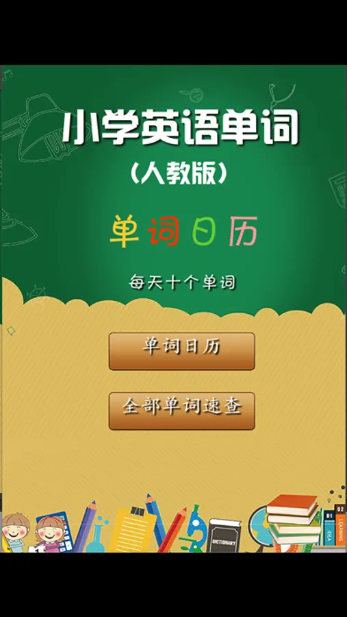 收录 人民教育出版社出版(人教版)小学英语所有单词,近900个单词的词量。每天学习十个单词,配合游戏方式熟记每个单词。通过每天不断练习,只需要一百天就可以让孩子提前掌握熟记小学英语的全部单词。