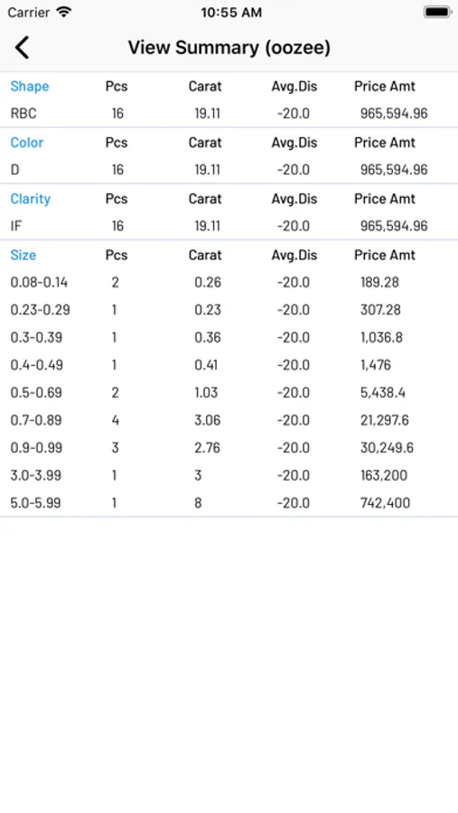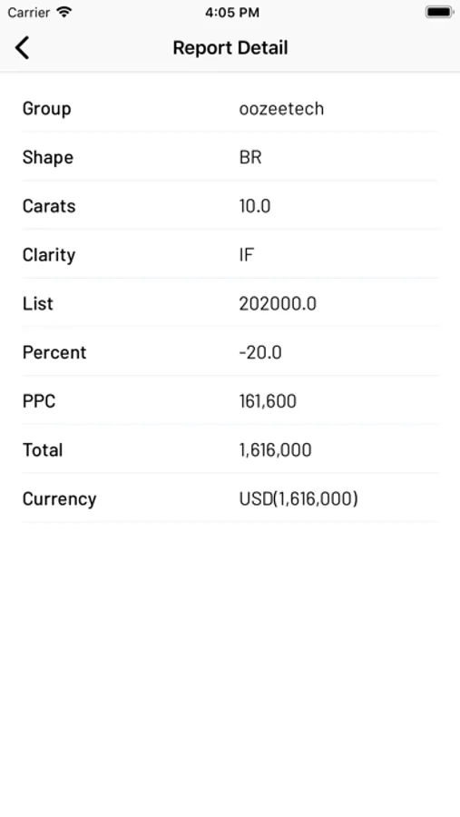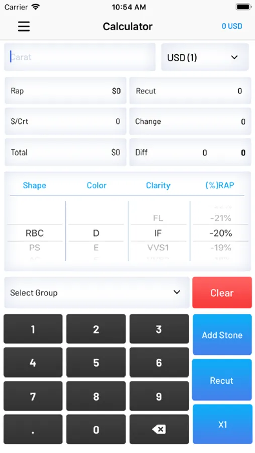 With Rap Calc you can calculate the price of the diamond with different parameters like Shape, Color, Clarity and Carat.