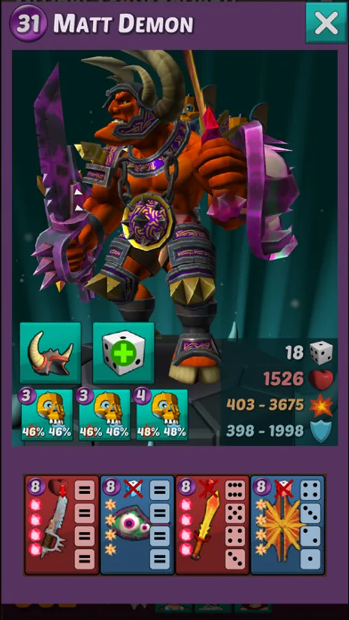 Recruit orcs, trolls, demons, skeletons, etc. Build your unique team with weapons, shields, special abilities, skill points, magic dice, minions, etc. Unlock your heroes’ unique abilities and improve them. Assign skill points to improve health, damage, defense, recovery speed, etc.