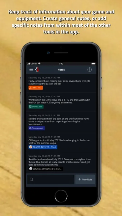 Keep track of information about your game and equipment. Create general notes, or add notes from within most of the other tools, such as for oil patterns, your bowling balls, Speed & RPM readings, Observation Trainer scores and more.