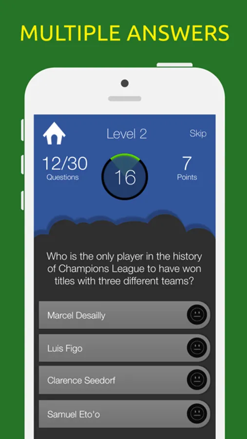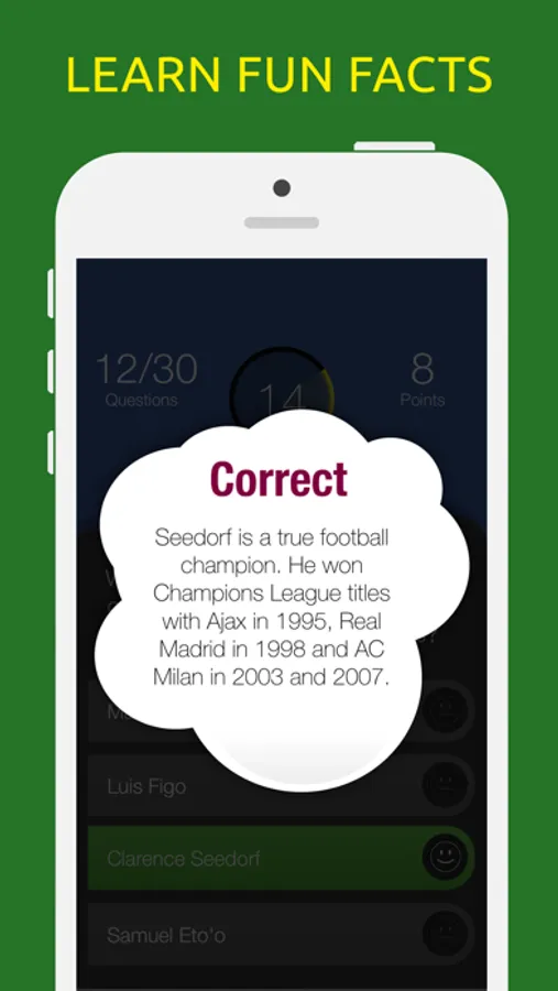 In this football quiz trivia game you will learn new facts and check your knowledge of world football: Champions League, World Cup, Euro Cup, Copa America, Premier League, Bundesliga, Primera and much more!