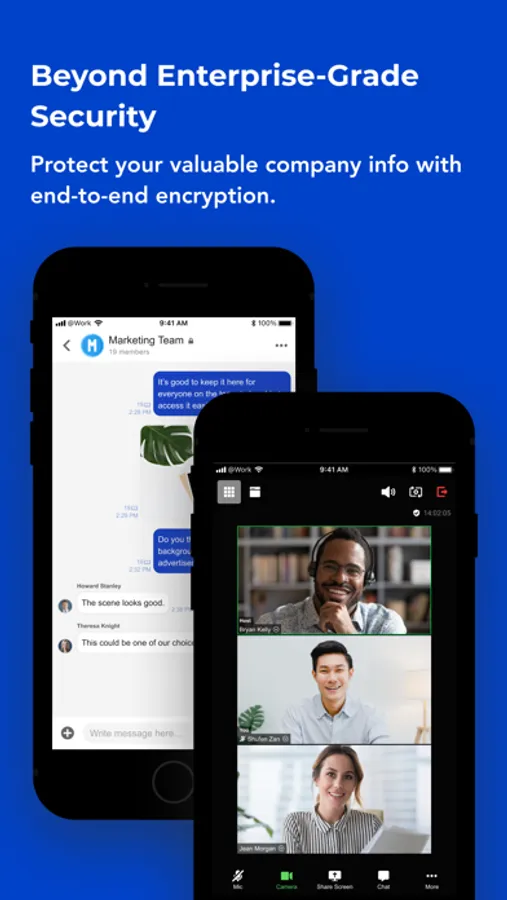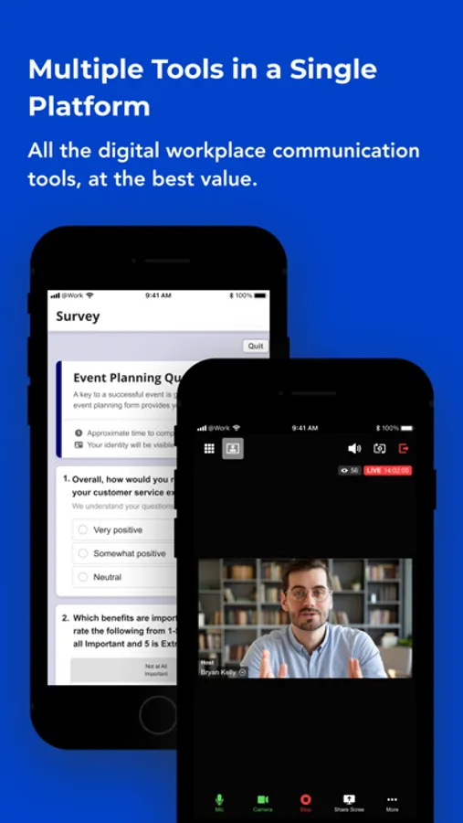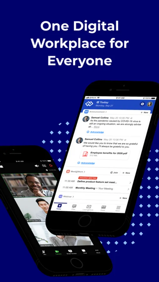 - Under the communication and collaboration functions, @work offers features such as chat, voice and video calls, online meeting, announcement and feed, live streaming and online survey.