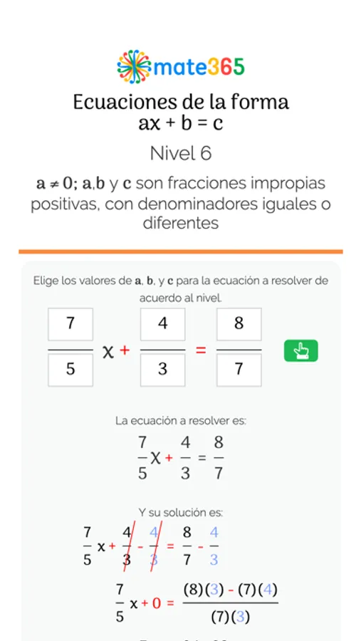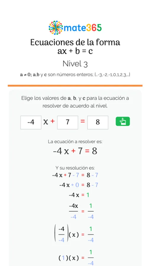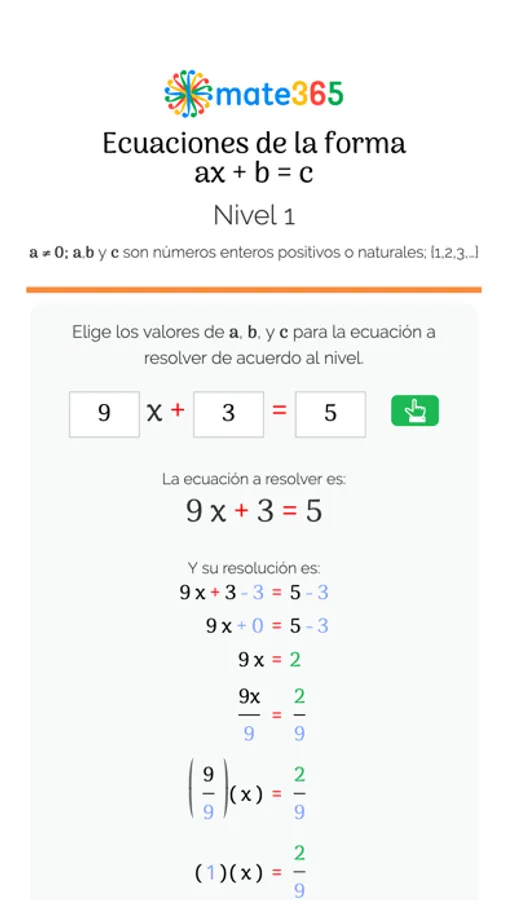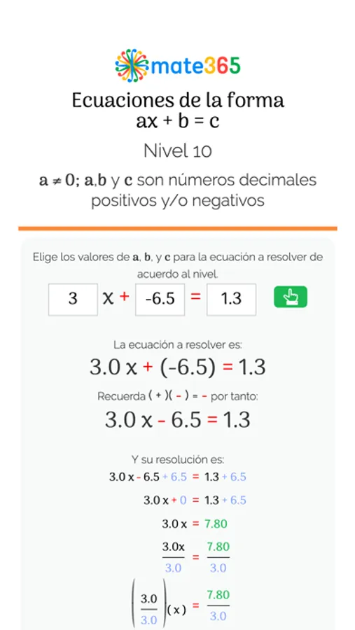 Mate365 presenta la aplicación para resolver ecuaciones de la forma: ax+b = c utilizando propiedades de los números, tales como el inverso aditivo, el inverso multiplicativo, agrupación y reducción de términos semejantes, etc, con la finalidad de despejar y obtener el valor correcto de la incógnita X.La resolución de ecuaciones de primer grado del tipo de ecuación referida, es básica para resolver otras ecuaciones lineales más complejas.