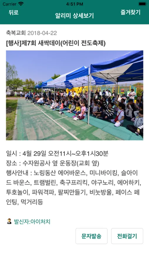 교회연락처를 통해서 문자를 발송하거나 전화를 걸 수 있습니다.