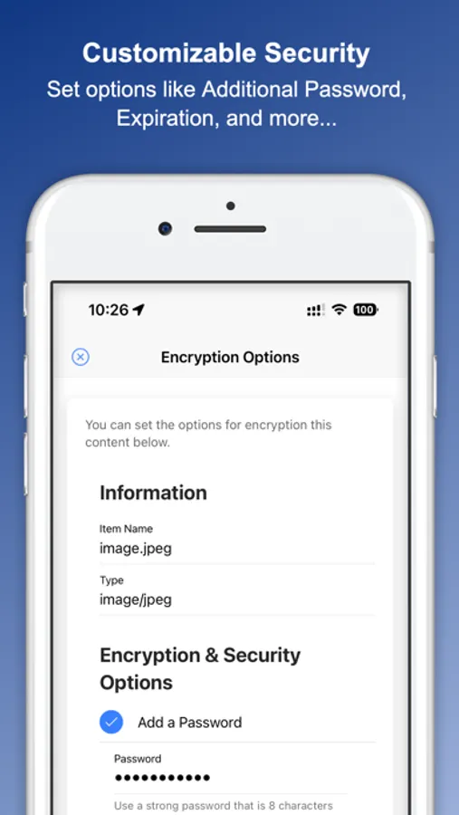 Additionally you can add more security by locking access to the file with a private password. You can also have the file expire and be securely destroyed from our servers after a period of time or after it has been read.