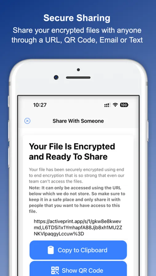 Each file is encrypted with end to end encryption and best in industry AES 256bit cryptography using a strong private key that is generated for you on the fly. The software incorporates this key into a private and unique URL that you can share with anyone from your mobile device using a QR code, copy and paste, or through a private email or text message through the app of your choice.