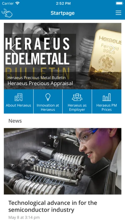 With Heraeus touch, you have access to all the news about the Heraeus Group - bundled in one app. In addition to interesting information on new products from our business units, you will also receive location information, such as availability in our parking garages, so that you are well prepared for your next visit to us.