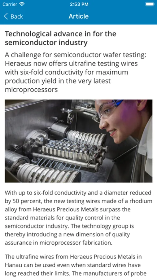 The Newsfeed provides you with the latest news about the company and its business units as well as information on worldwide job vacancies directly to your mobile device. We also provide you with lots of exciting information about product innovations at Heraeus. Thanks to the push notifications, you won't miss any news about us - and you can spread it conveniently via the Share function in your social network. Our trade fair calendar informs you about all current dates when you can meet us.