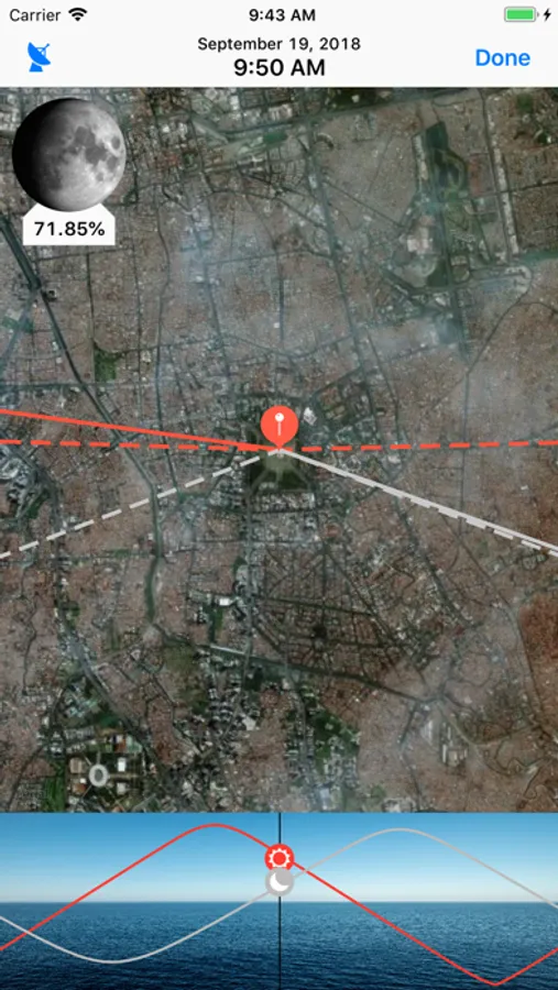 • The percentage of the moon's illumination is provided as well as times for sunrise, sunset, moonrise, and moonset.
