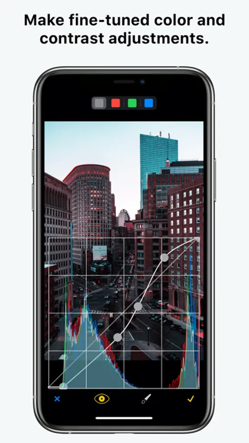 • Curves: precise control over the brightness levels in your photos, supports rgb, red, green and blue channels