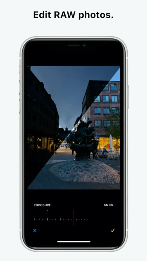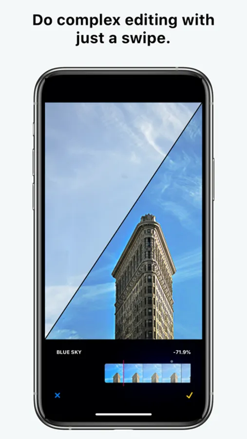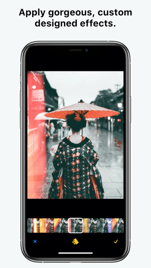 • Black and white: with a single swipe go through dozens of black and white effects and later fine tune the tone, intensity and optionally add grain