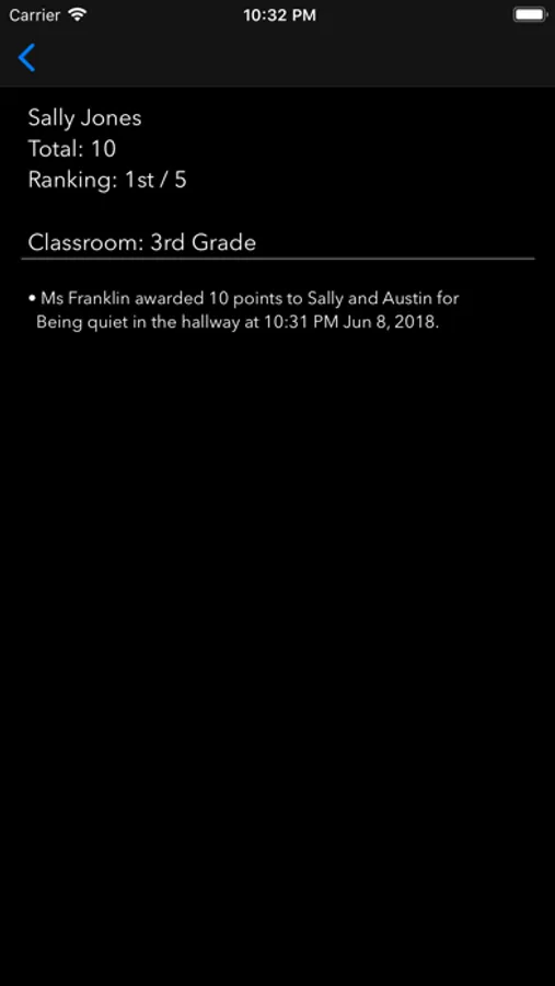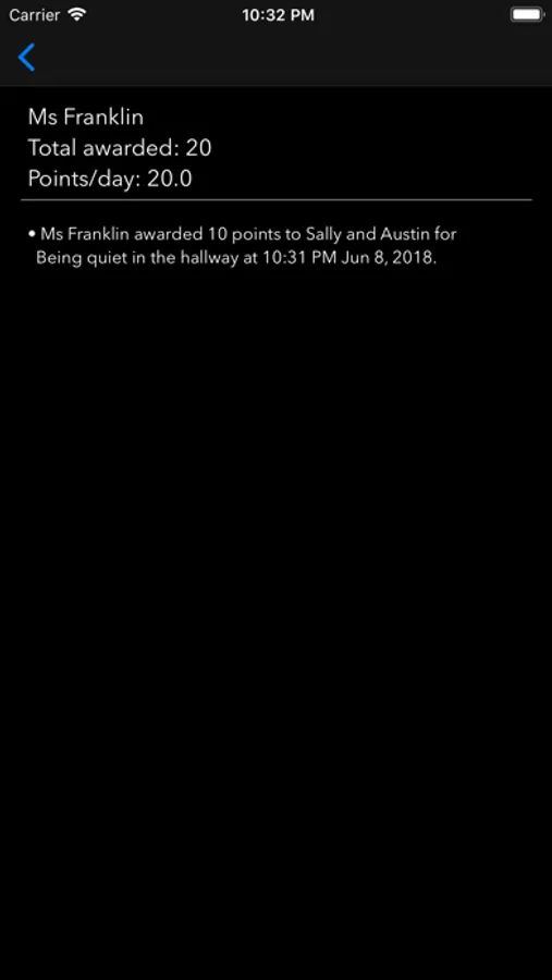 Teachers setup the app for their classes and select individual or groups of students, points and tags - the reason for awarding points - throughout the day. With a tap of a button, the list of students can be sorted with their relative scores. A tap on the student report button gives a report of each award assignment and the students' ranking in the class. Teachers can easily review their own performance too.