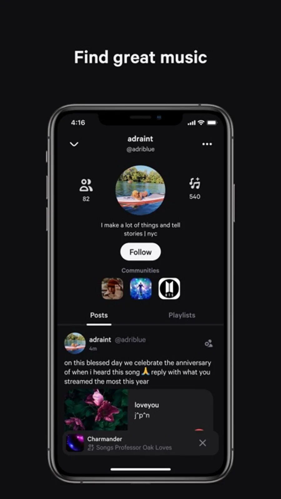 Explore and join music communities to collaborate on playlists, meet other fans, or just share that song you can’t get out of your head. Host a streaming party and help your favorite artist dominate the charts. Flex the number of new artists you discovered before they were cool. Music should be social, even when it’s playing from your phone.