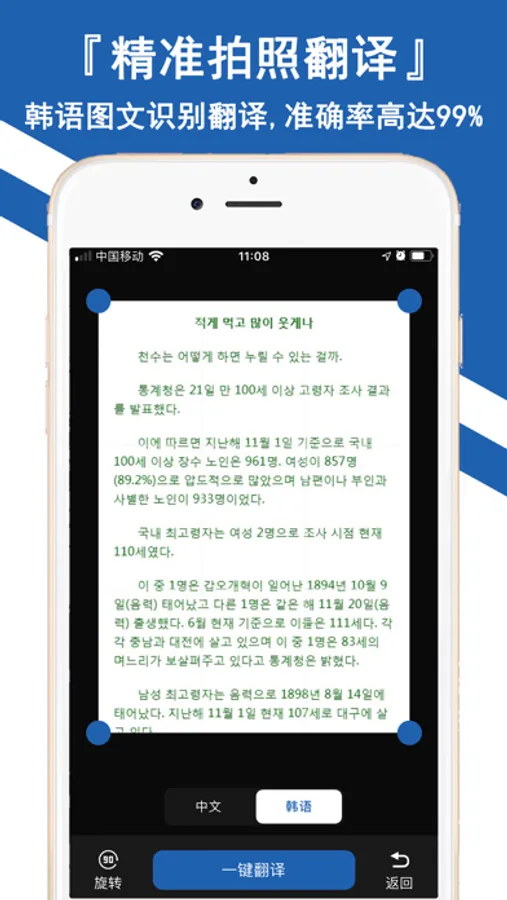 - 拍照翻译:随身拍照片识别翻译、相册选图翻译任意选;拍照一键翻译,旅游出行、阅读韩语学习,高效率翻译利器。