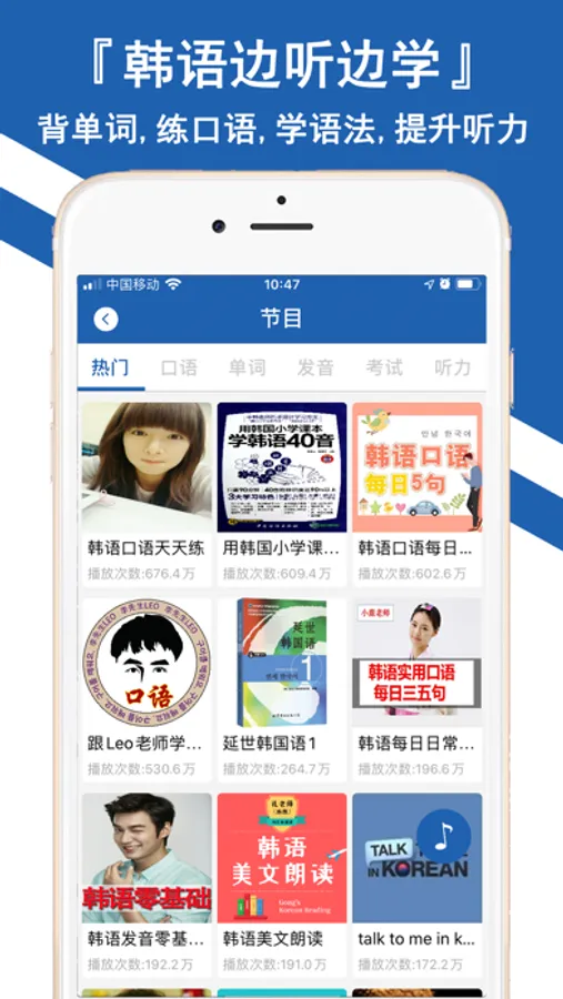 - 有声节目:整合口语、单词、发音、考试、听力有声教学节目,在线边听边学韩语。