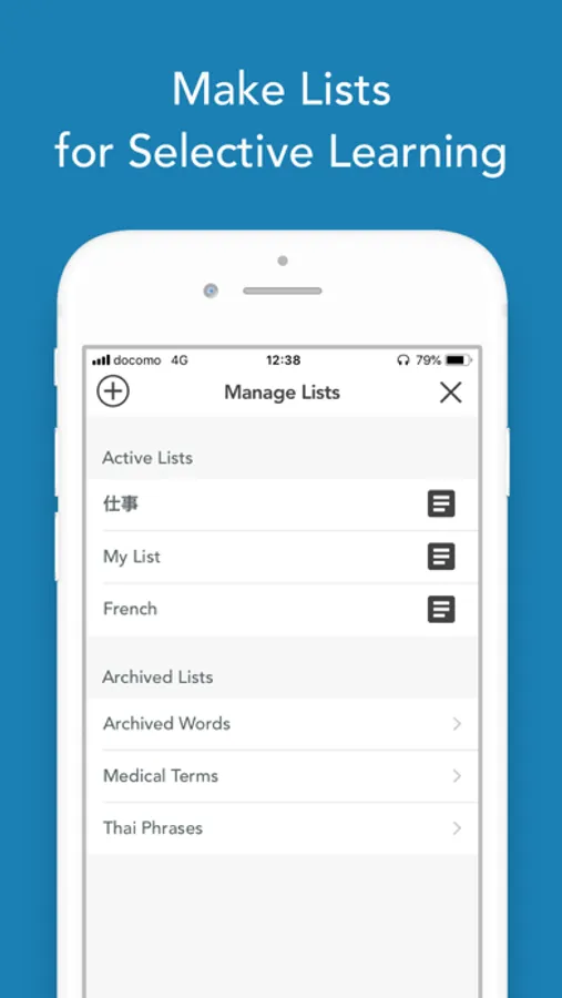 Capture and organize the words in your life into lists such as work-related (Work), class-related (Biology/Economics/etc.), or travel-related (Thai Phrases). Make lists active for testing, or archive them for later.