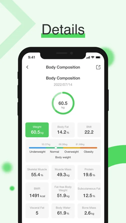 Arboleaf app and Smart Scale make it easier for you to track your health, fitness and set goals. Step on the Smart Scale, you can have your overall body composition data including: