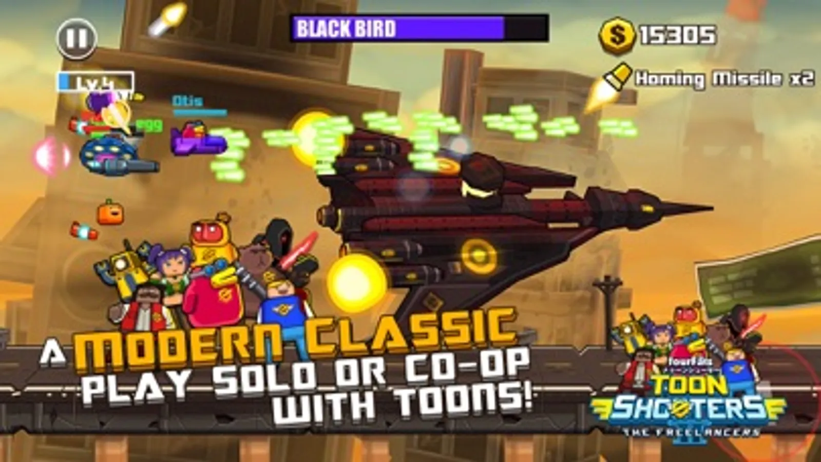 Toon Shooters 2 is an arcade side-scrolling shooter 'shmup' inspired by the long lost classics of Gradius/R-Type/Salamander and more... Up to 5 Co-Op play available), different characters with various roles and abilities.