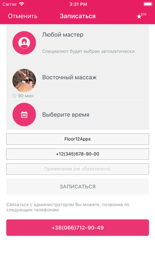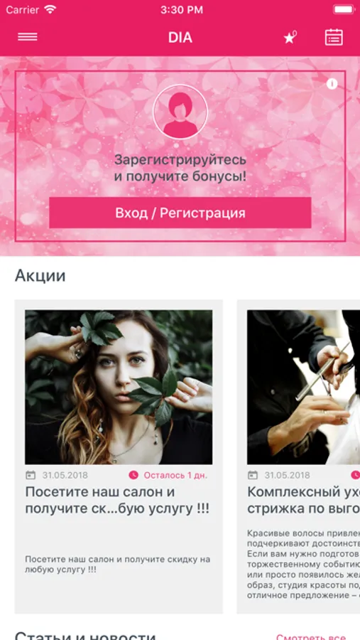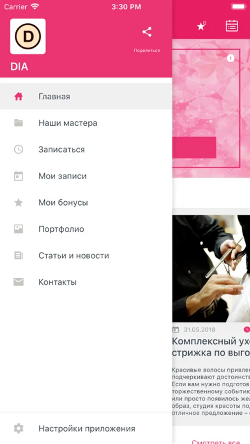 Приложение помогает пользователю произвести процедуру записи в салон DIA.